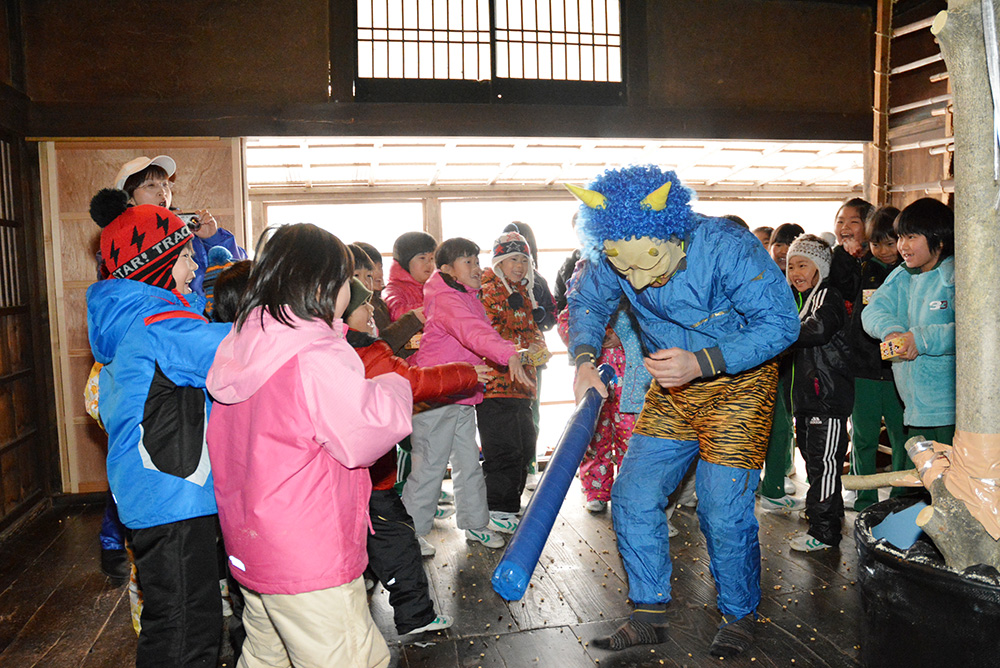 節分にちなみ、翁島小学校の1年生と3年生は、野口英世博士の生家で豆まきをしました。鬼に扮した先生らが現れると、児童らは「鬼は外、福は内」と元気な声を響かせながら、勢いよく豆をまきました。