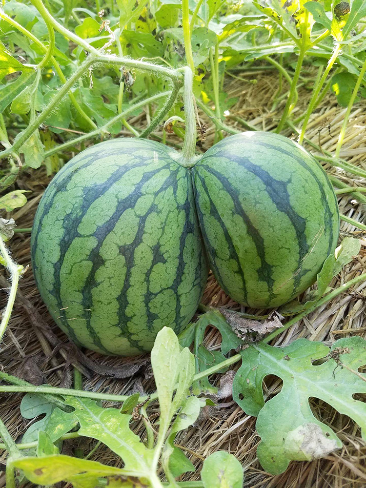 小水沢の阿部清美さんがビニールハウスで栽培している小玉スイカの中に、2つの玉がくっついた珍しいスイカができました。大きさは両方の玉を合わせて22㌢ほど。孫の大島力くんが味見したところ、とっても甘かったそうです。