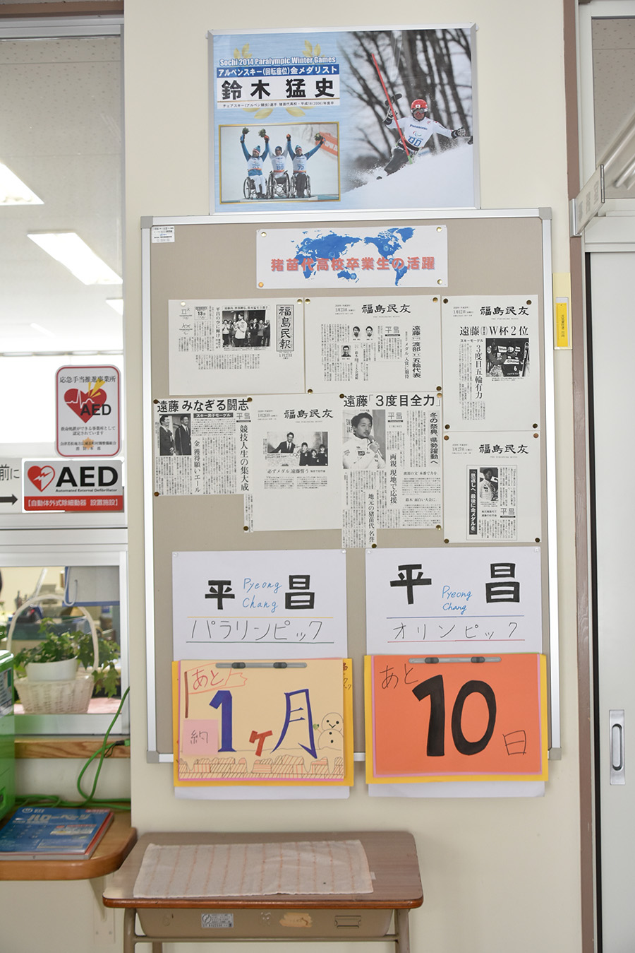 猪苗代高校では、生徒会役員の生徒が中心となり、平昌五輪・パラリンピック開催までのカウントダウンボードを作成しました。 モーグルの遠藤選手、ノルディック複合の渡部選手、パラリンピック・アルペンの鈴木選手はいずれも猪苗代高校の卒業生です。 猪苗代高校の在校生も3選手を応援しています!