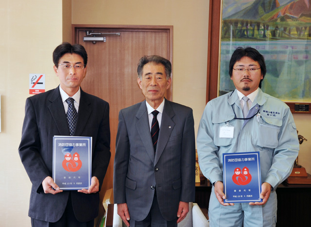 町消防団協力事業所表示証交付式は27日、役場応接室で行われました。式では、渡部電気工業株式会社(渡部裕一代表取締役)、株式会社森口電気商会(森口和広代表取締役)に表示証が手渡されました。(写真左から渡部代表取締役、津金町長、森口真人取締役)社員の消防団活動についてご理解、ご協力をいただきありがとうございます。今後ともよろしくお願いします。