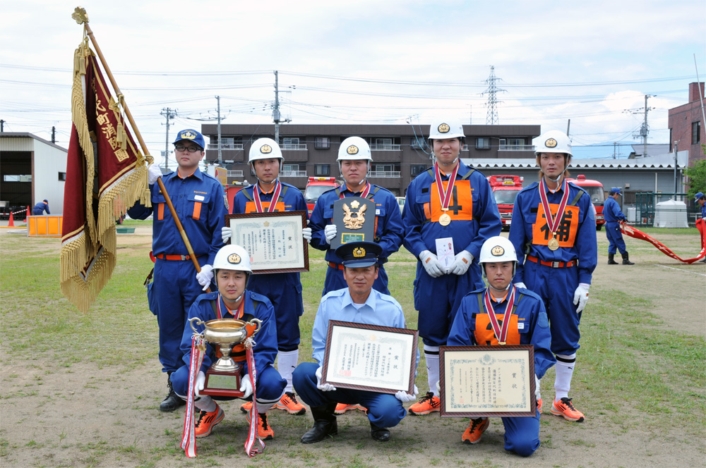 ポンプ車操法の部で優勝した第4分団の選手ら