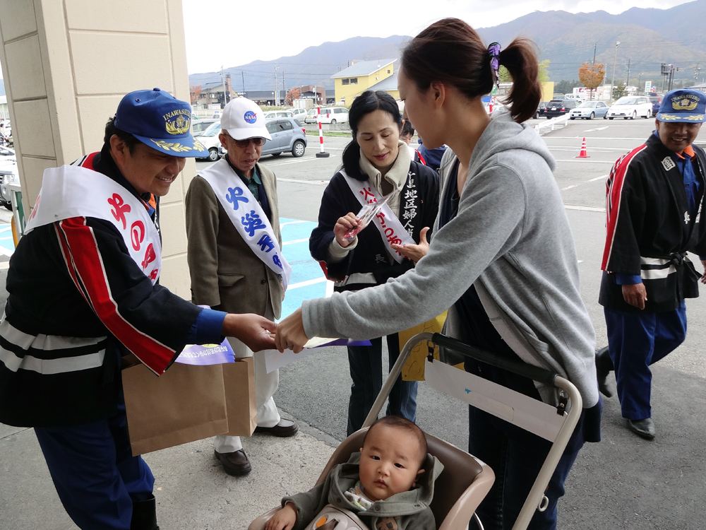 会津若松地方広域市町村圏整備組合消防本部と猪苗代消防署の街頭啓発活動は11月9日、ヨークベニマル猪苗代店で実施されました。活動には消防署員の他、町消防団幹部、町婦人消防隊、纏の会会員などから15人が参加。買い物客に防火を呼び掛けるチラシやティッシュなどを配り、火災予防と住宅用火災警報器の設置を呼びかけました。