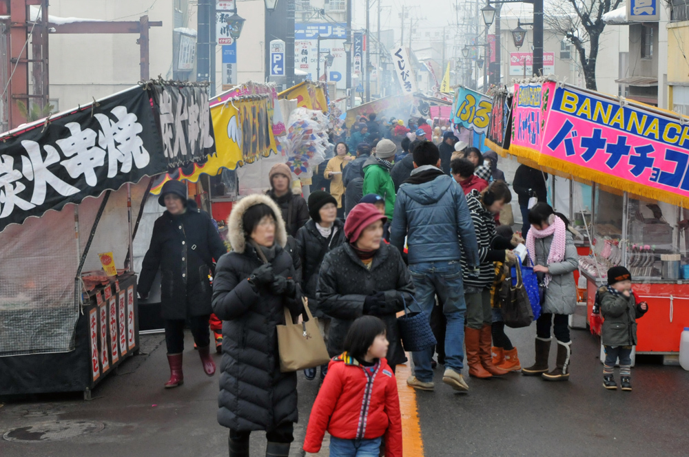 新春恒例の初市「十三日市」は1月13日、中央通り商店街で開かれました。オープニングセレモニーでは、大川原勝人実行委員長が「十三日市をきっかけに町の活性化を図りたい」とあいさつ。神事、鏡開きや猪苗代芸能保存会の太鼓演奏の後、先着150人に福袋がプレゼントされました。 通りには起き上がり小法師、風車やだるまなどの縁起物や飲食物などの露店が並び、多くの買い物客でにぎわいました。