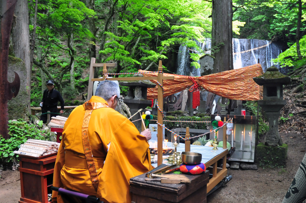 達沢不動滝で6月2日、達沢不動明王祭礼が行われました。今年の祭礼ではかつて行われていた護摩供養が今年約40年ぶりに復活しました。地区住民や観光客らが見守る中、「家内安全」「商売繁盛」などの願いが書かれた約300枚の添護摩木がたかれ、成就を祈りました。祭礼を主催している達沢文化保存会の中西厚志会長は「来年以降も護摩供養を続けて、町おこしにつなげていきたい」と話しました。