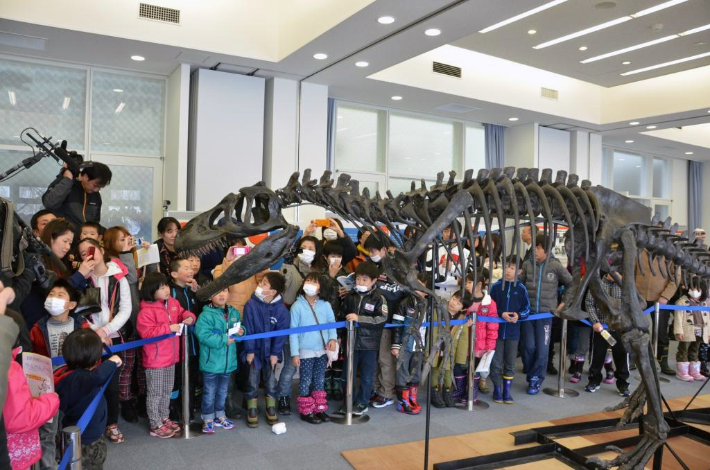震災復興・国立科学博物館コラボミュージアムin猪苗代「アロサウルスが学びいなにくるーー!」のオープニングセレモニーは2月11日、学びいなで行われ、約400人の来場者で賑わいました。式典に先立ち、国立科学博物館によるアロサウルス全身骨格標本の公開組み立てが行なわれ、来場者たちはめったに見ることのできない実物のアロサウルスの威容さに驚いていました。式典では、内山祐二郎国立科学博物館事業推進部長と土屋重憲町教育委員会教育長によるあいさつの後、関係者によるテープカットが行なわれ、コラボミュージアムは盛大に開幕しました。