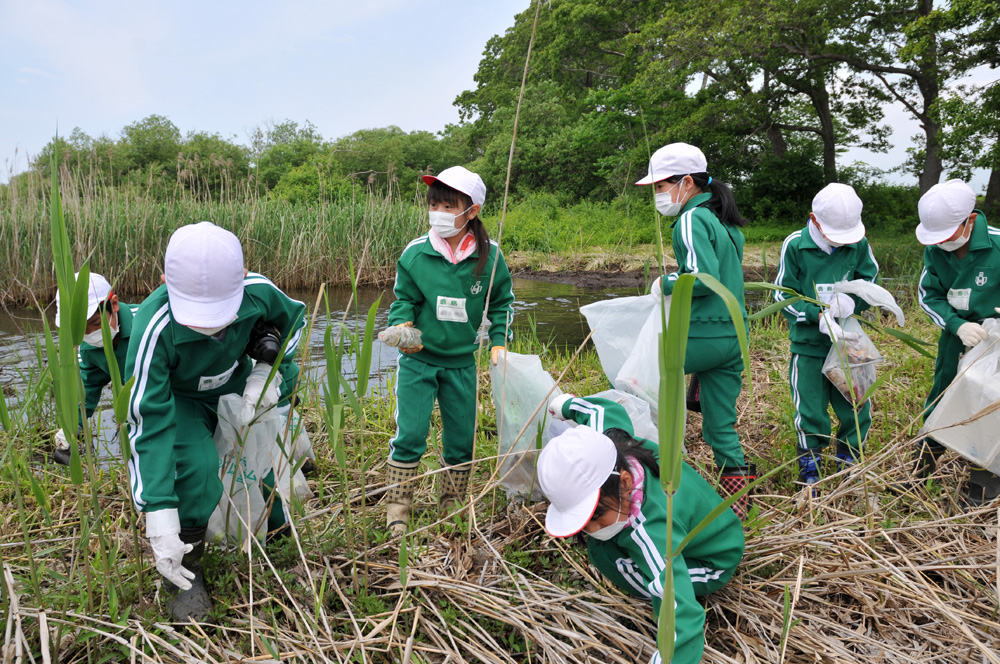 翁島小学校は6月4日、猪苗代湖北岸でクリーン作戦を実施しました。同校では、総合的な学習の時間を利用し、1年を通して猪苗代湖を中心とした環境学習に取り組んでいます。クリーン作戦はこの学習の一環として行われたもので、全校児童と保護者ら合わせて約100人が参加。子どもたちは水質日本一の復活を願って、熱心にごみを拾い集めました。