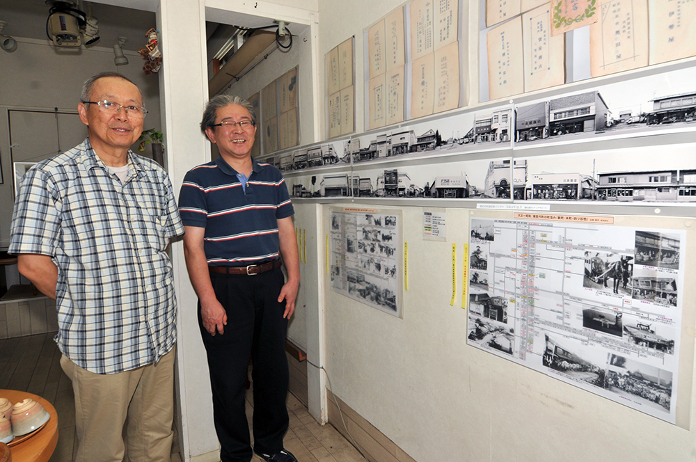 パノラマ写真は同スタジオを経営する山内晴也さんが撮影。街並み地図は新明家具の新明哲也さんが制作しました。「歴史を振り返り、これからのことを考えてもらいたい」と話す両氏。「評判は上々。これからお盆を迎えるので、町を出た人たちにも帰省した際にぜひ立ち寄ってもらいたいですね」と期待を込めます。