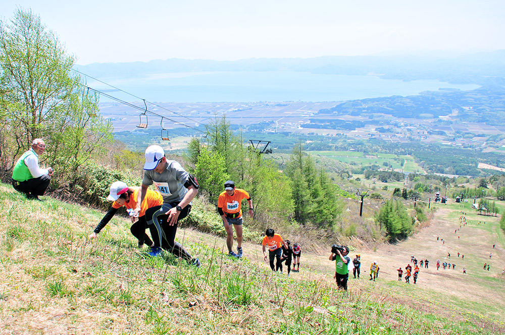 スキー場のゲレンデを駆け上がる「ゲレンデ逆走マラソン」の今季開幕戦は5月6日、グランドサンピア猪苗代リゾートスキー場で開かれました。レースは10㌔と5㌔の2部門で争われ、県内外から集まった約280人の選手たちが猪苗代湖を眼下に望むコースを力強く駆け抜けました。ゲレンデ逆走マラソンは、「GAMBARUZO!ふくしま実行委員会」が東京電力福島第一原発事故の風評被害払拭などを目的に2011年から開催していて、今季は町内の6スキー場を舞台に全6戦が繰り広げられます。