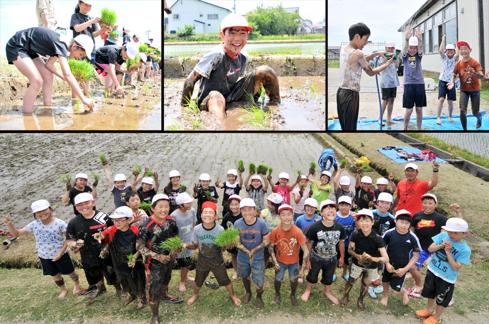 千里小学校の5年生32人は5月26日、町農業活性化センター(アグリいな)で田植えを体験しました。職員による説明の後、児童が裸足で田んぼに入り、一列に並んで田植えを開始。子どもたちは、ぬかるみに足を取られて転んだり、足が抜けなくなり友達に助けてもらったりと、悪戦苦闘しながらも楽しそうに取り組んでいました。秋には、この田んぼで稲刈りを体験する予定です。