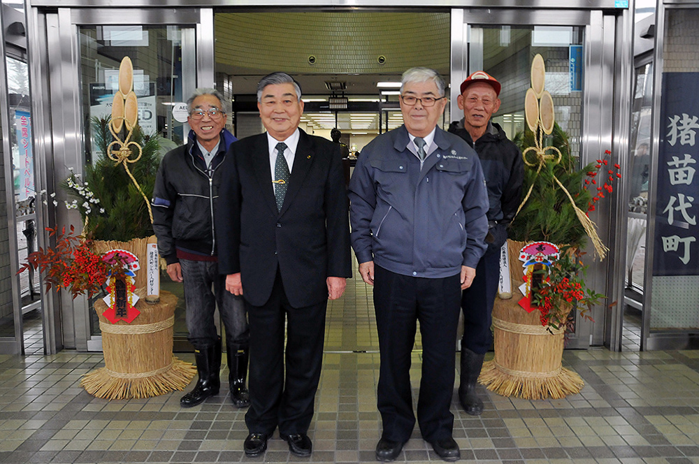 町シルバー人材センターは12月25日、町役場に門松を寄贈しました。同センターは毎年、会員の皆さんが作った門松を町役場などに贈呈していています。町役場の贈呈式には同センターの増子恒三理事長が会員の皆さんと共に訪れ、正面入り口に設置しました。