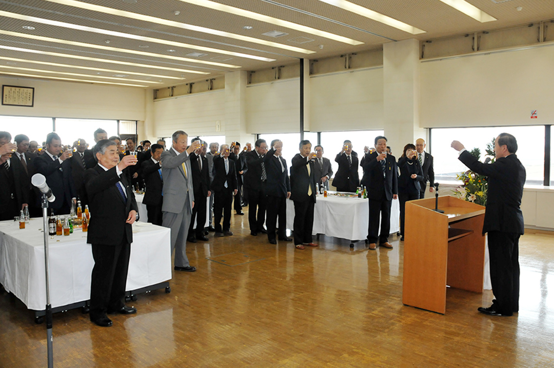 平成28年の猪苗代町新年あいさつ交歓会は1月4日、町役場で開かれ、出席者が新年を祝うとともに、さらなる飛躍を誓いました。町内の各団体などから約140人が出席。前後公町長のあいさつ、長沼一夫町議会議長の祝辞に続き、小檜山善継県議の発声で乾杯し、出席者が抱負を語り合い親睦を深めました。