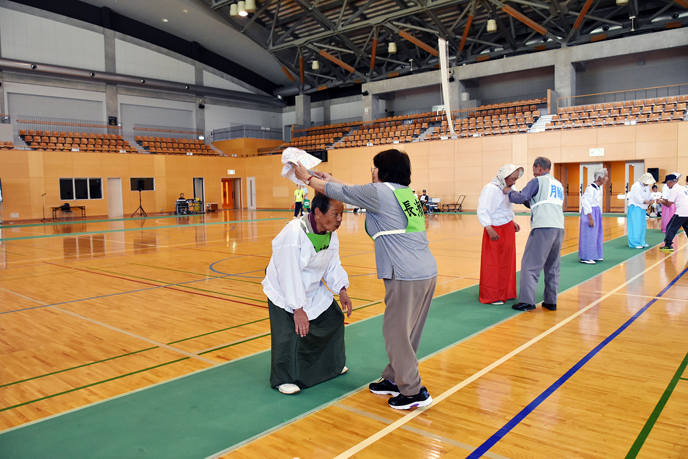 高齢者スポーツ大会は6月17日、カメリーナで開かれました。町内6地区から163人が参加し、仲間たちと心地よい汗を流しました。