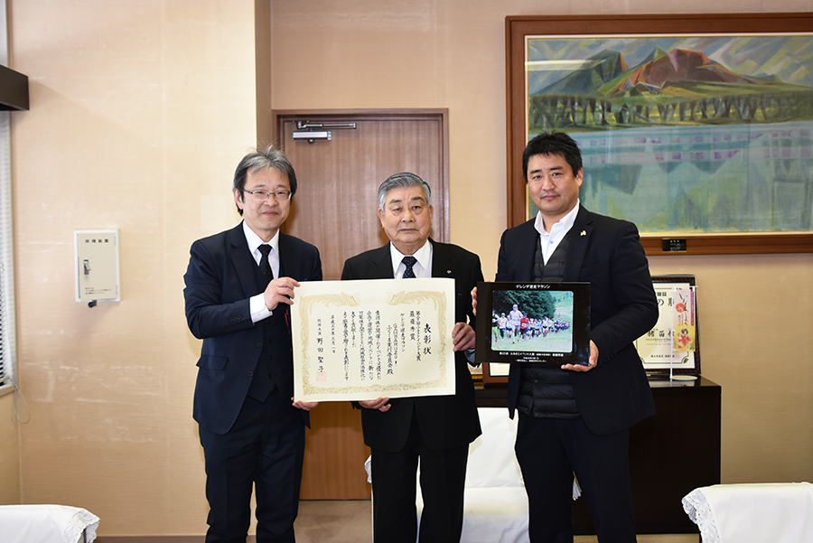 地域活性化センターが主催する第22回ふるさとイベント大賞で最優秀賞(総務大臣賞)を受賞したGAMBARUZO!ふくしま実行委員会の佐藤勇一事務局長と樋口弘明委員は3月5日、町役場を訪れ、前後公町長に「ゲレンデ逆走マラソン」での受賞を報告しました。
