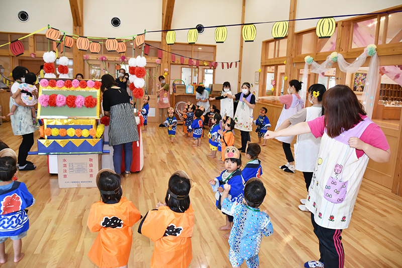 ひまわりこども園では8月25日、同園で「夏祭り」を開き、乳児部の園児がお祭りの雰囲気を楽しみました。