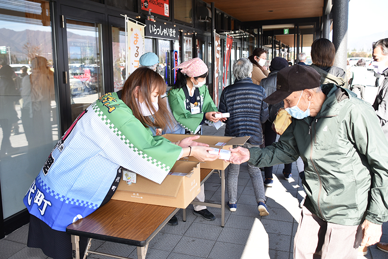 道の駅猪苗代の開業4周年を記念した感謝祭は11月19日から22日まで、同所で開かれています。初日の19日には、11時から先着200人に紅白饅頭や甘酒の振る舞いが行われました。