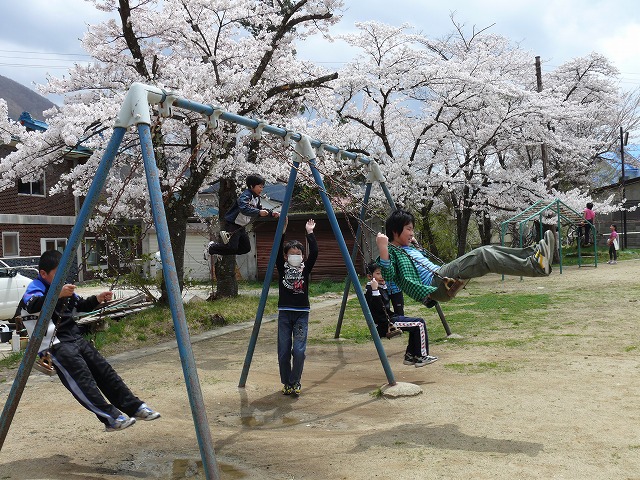 休み時間になると、子どもたちは、美しい桜を眺めながら元気いっぱい遊んでいました。