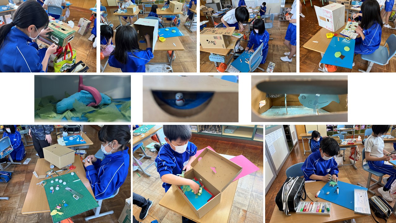 この「のぞいてみると」の学習では,思い思いに箱を持ち寄り,その箱の中に自分のイメージする世界を作り上げていきます。