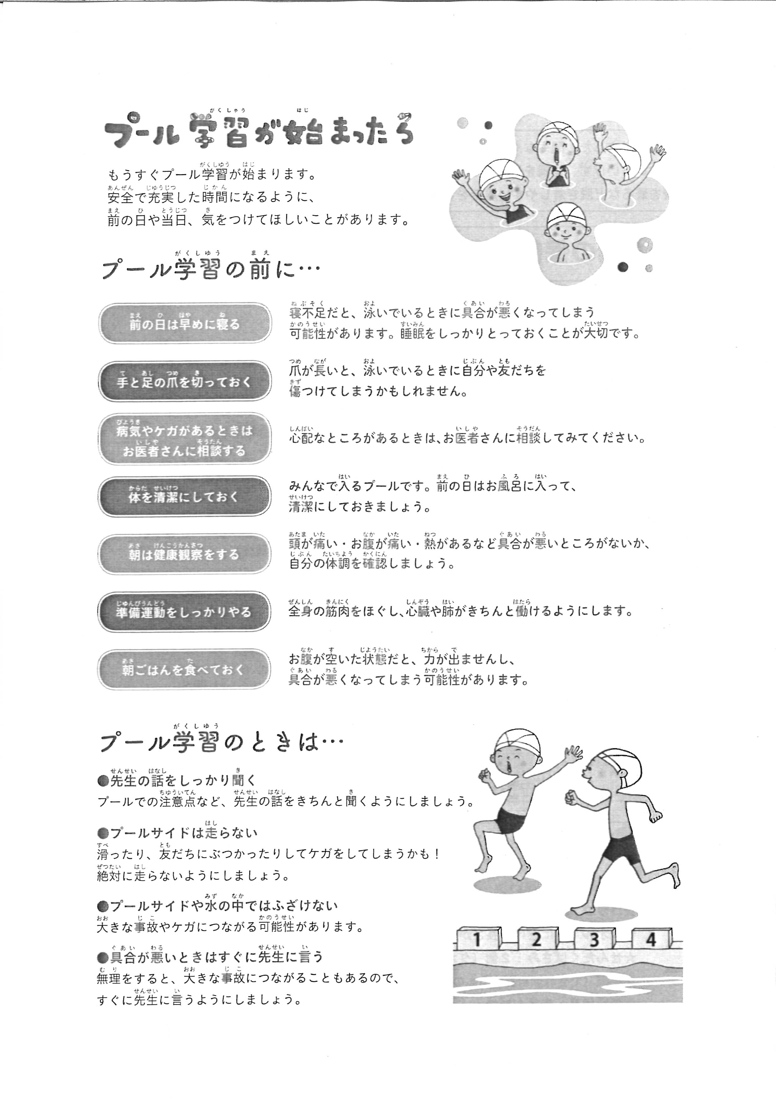 ほけんだよりの裏面には、プール学習についての注意事項等が記載されていますので、お子さんと一緒に読むなど確認をお願いします。 (添付しました。)