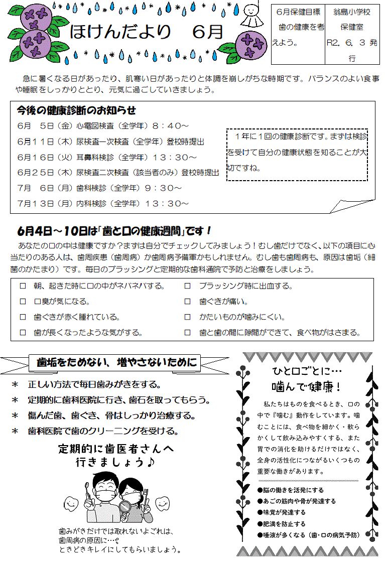 6月のほけんだよりを掲載いたします。今回の内容は、今後の健康診断日程、歯と口の健康についてです。