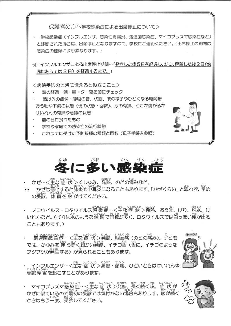 ほけんだよりの12月号の裏面を添付いたします。インフルエンザにもしかかってしまったら……の対応等が記載されています。