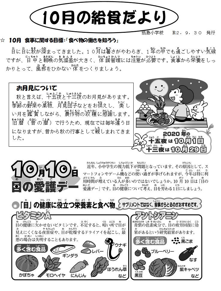 また、10月10日は「目の愛護デー」でした。この機会に、食べ物の好き嫌いを見直し、健康な生活ができるよう、ご家族で話し合ってみてはいかがでしょうか。