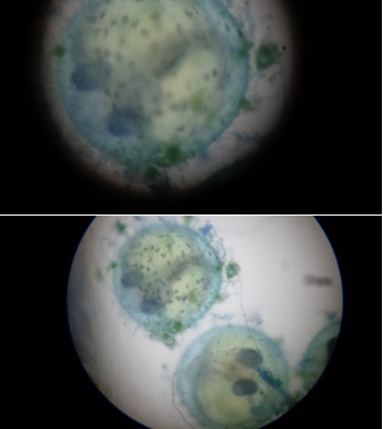 5月2日(水)のメダカの卵の様子です。昨日は、空気の泡のような物がたまごの端にありましたが、その泡が、少し中心の方に移動しているようです。また、たまごの中に鼓(つづみ)のような形が見えます。