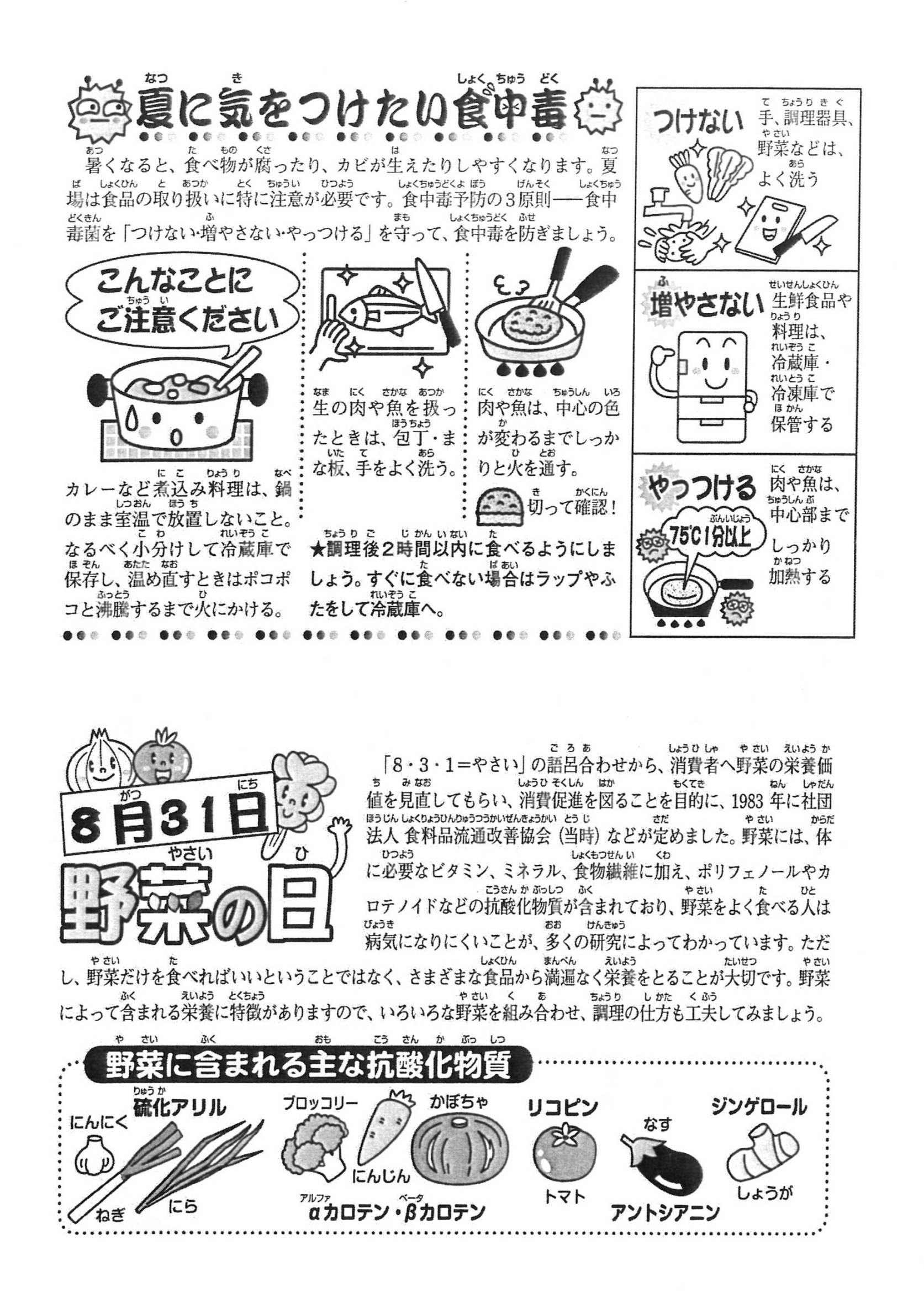 今回は、裏面に「夏に気をつけたい食中毒」として注意事項が何点かあげられています。また、夏野菜の栄養について書いてありますので是非参考にしてください。
