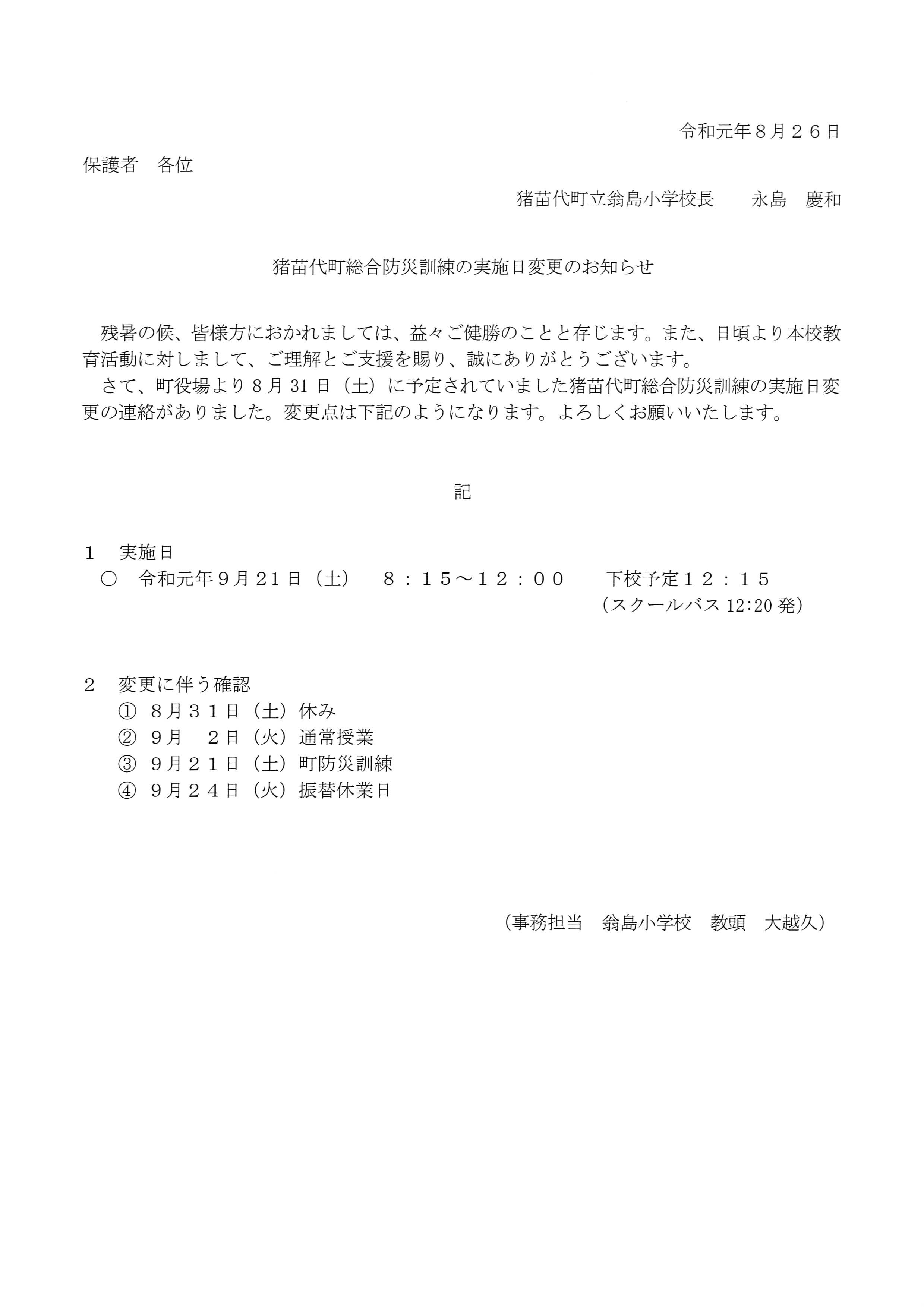 8月26日(月)の始業式当日に学校からのおたよりでもお知らせしますが、、年度初め、8月31日(土)に予定されていた町総合防災訓練の日程が変更になります。町当局から連絡がありました。急な変更で大変申し訳ありません。