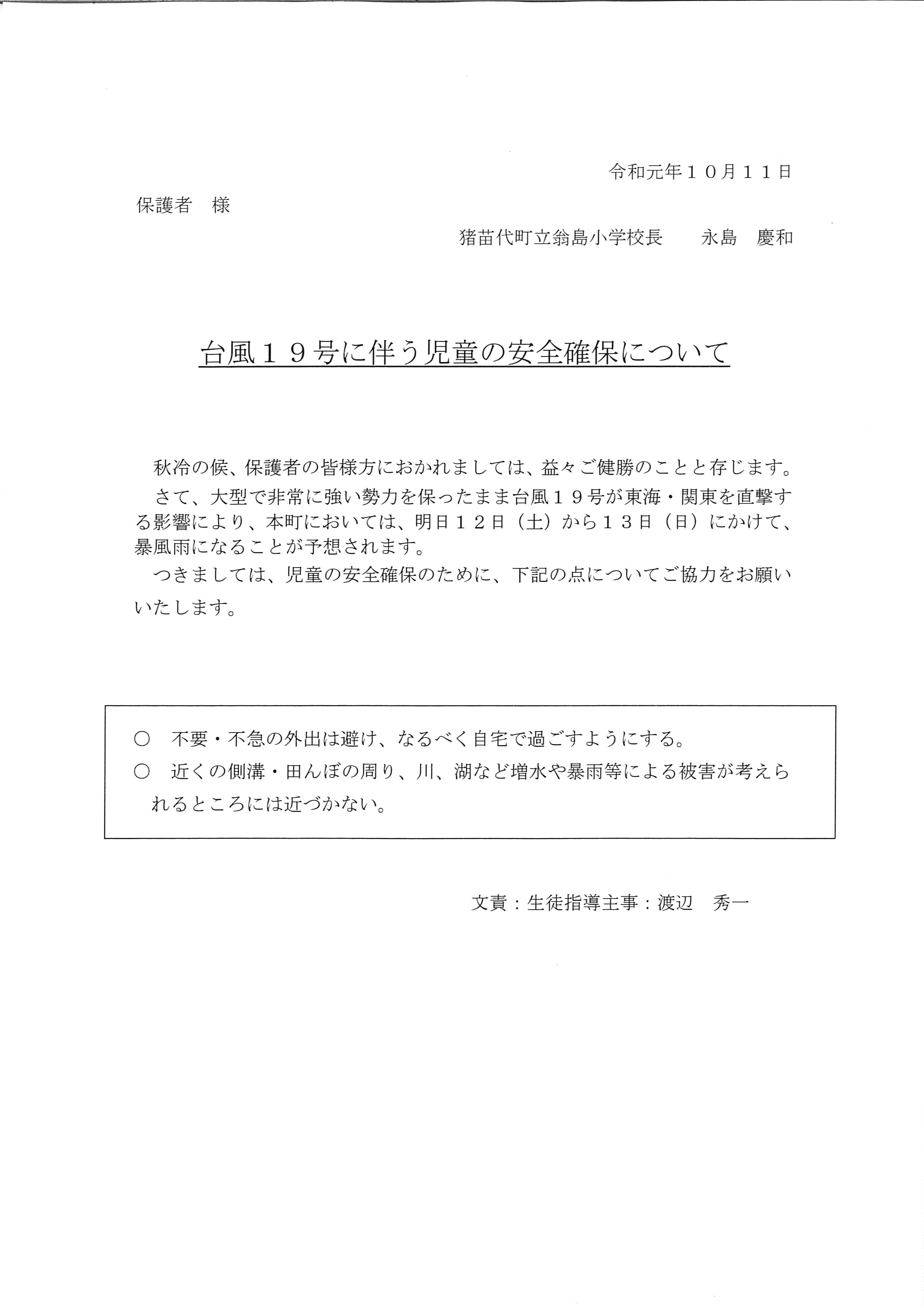子どもたち及びご家庭の皆様の安全確保のため、「不要・不急の外出は避け、なるべく自宅で過ごすようにする」ことや「近隣の水辺(河川や湖など)に近づかない」などの約束を守って、安全にお過ごしいただきたいと思います。各学級では、具体的な指導をいたしました。