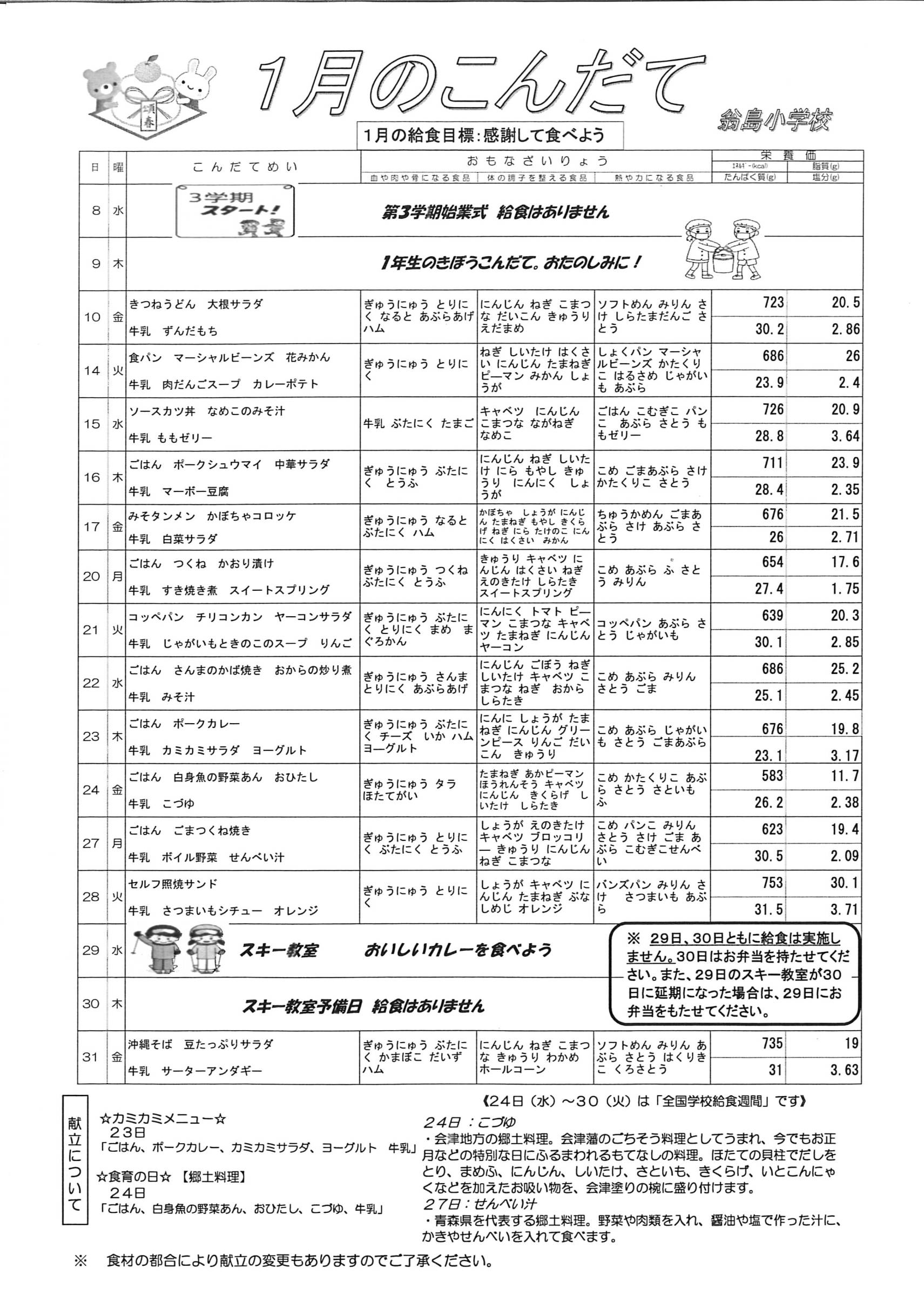 ○29日(水)30日(木)は、スキー教室及びスキー教室予備日のため給食がありません。