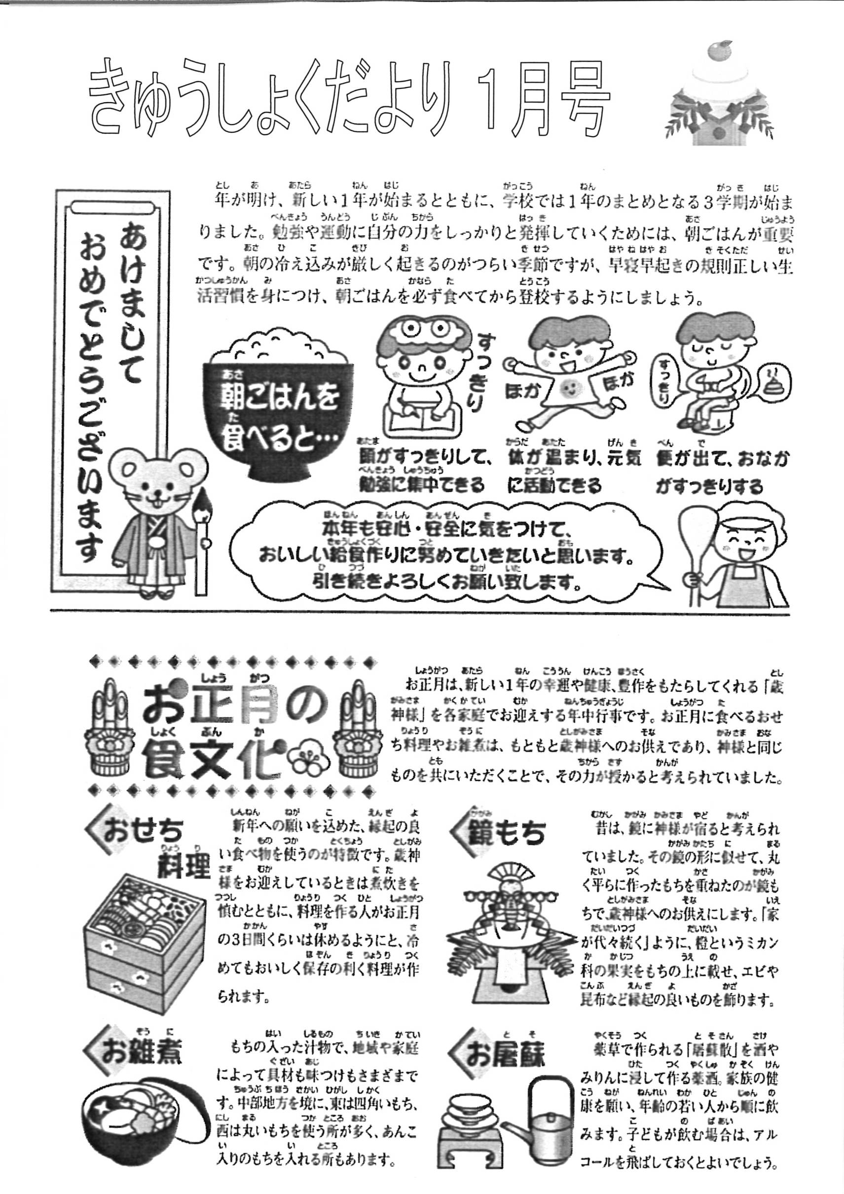 今回の給食だよりには、「朝ご飯を食べると…」として、朝ご飯を摂ることのよさや、「お正月の食文化」について書かれていますのでご家族でご覧ください。