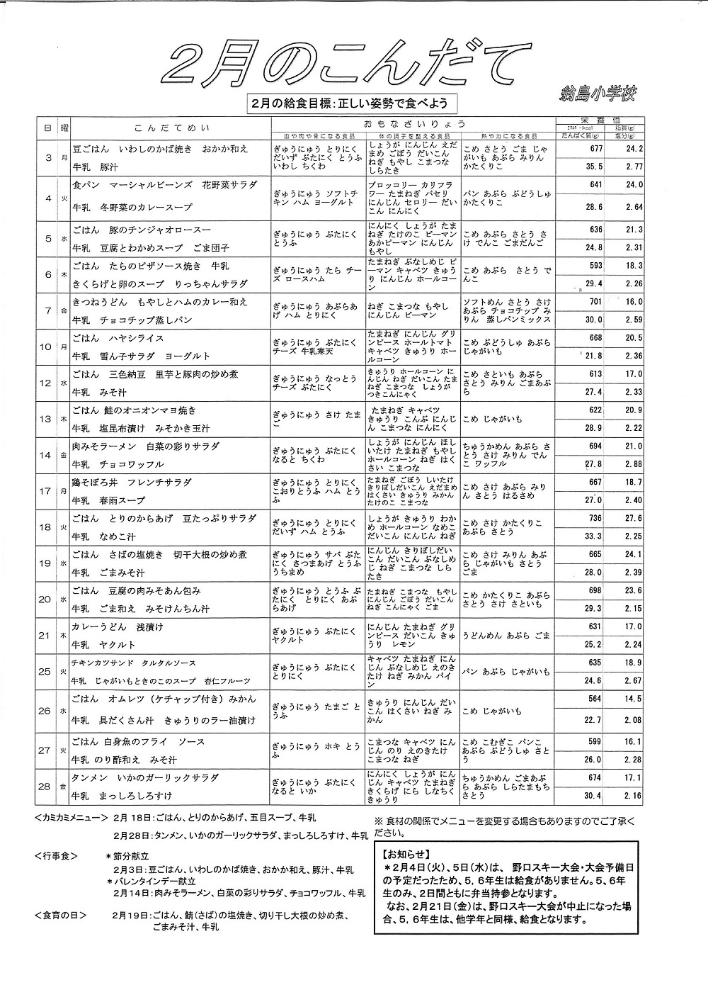 なお、2月21日(金)は、野口スキー大会が中止になった場合には、5・6年生は他学年と同様に給食が提供されます。