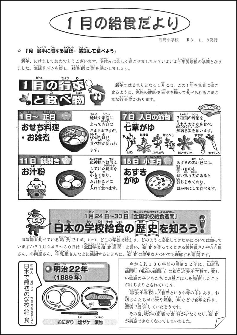 また、1月24日~30日は全国学校給食週間です。本校は29日はスキー教室のため給食はありませんので、25日~28日で全国学校給食週間に関する取り組みを実施予定です。
