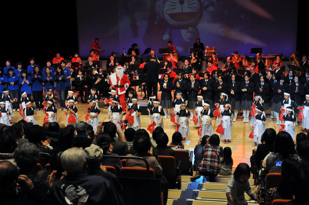 猪苗代吹奏楽団が主催する「東日本大震災復興支援音楽祭2012 いなわしろ音楽祭」は12月8日、学びいなで開かれました。同楽団の他、猪苗代高校吹奏楽委員会、福島県ばんだい荘あおば、猪苗代中学校3年3組、東中学校合唱部、千里幼稚園など町内の団体に加え、東京都から中野坂上ウインドオーケストラと実践学園高校合唱部も参加。吹奏楽はもちろん、太鼓や合唱などさまざまな音楽が観客の心を癒しました。