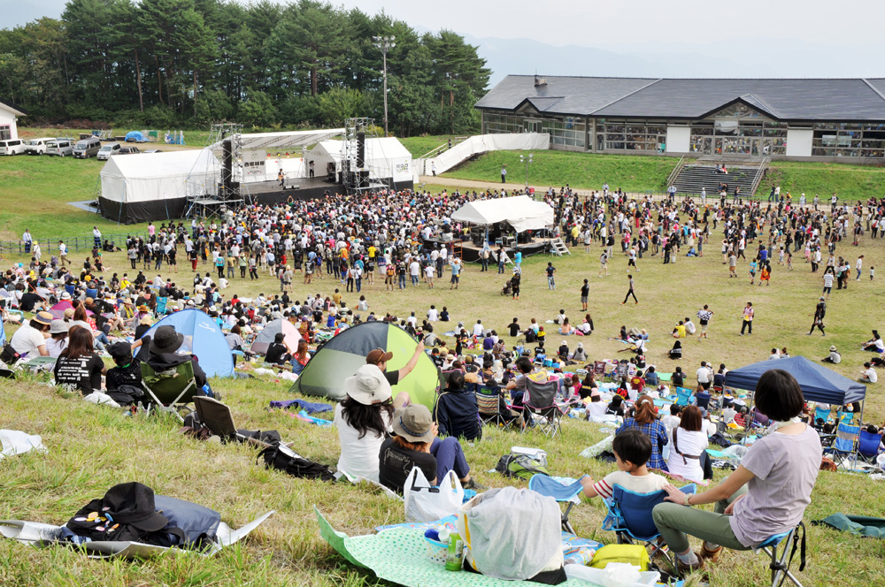 テントを張ったり、斜面に座ったりと、思い思いにイベントを楽しむ来場者ら