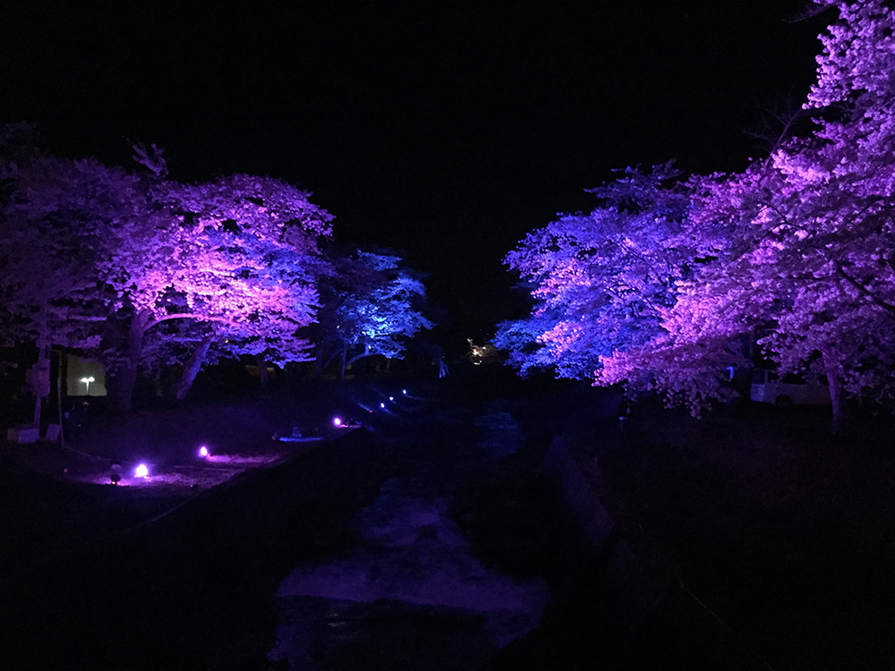 ライトアップの場所は桜まつり駐車場付近(東中学校北側)で点灯時間は午後6時から午後10時まで。5月6日まで実施される予定です。さまざまな色に浮かび上がる桜をぜひご覧ください。
