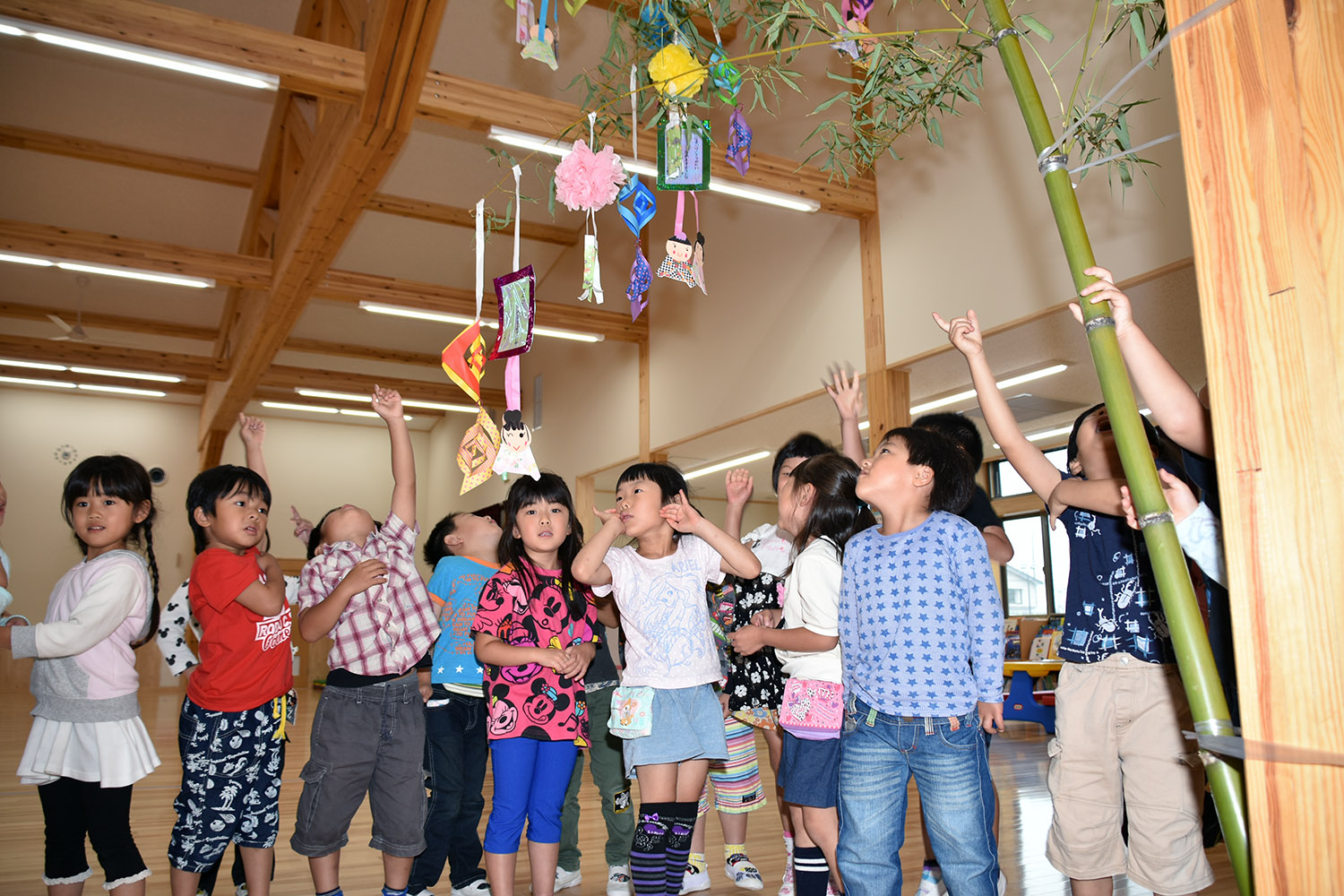 ひまわりこども園では7月5日、園児たちがそれぞれの願い事を書いた短冊を笹に飾り付けました。