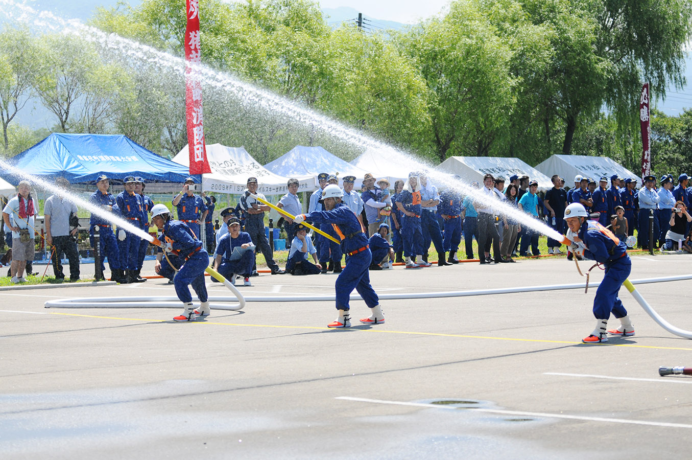 北会津地方消防操法大会は8月7日、町水防センターで開かれ、会津若松市、猪苗代町、磐梯町の代表チームがポンプ車操法と小型ポンプ操法を競いました。 ポンプ車操法の部では、猪苗代町消防団第5分団が見事優勝。小型ポンプの部では6分団が準優勝しました。 優勝した5分団チームは、9月4日に福島市で開催される県大会に出場します。