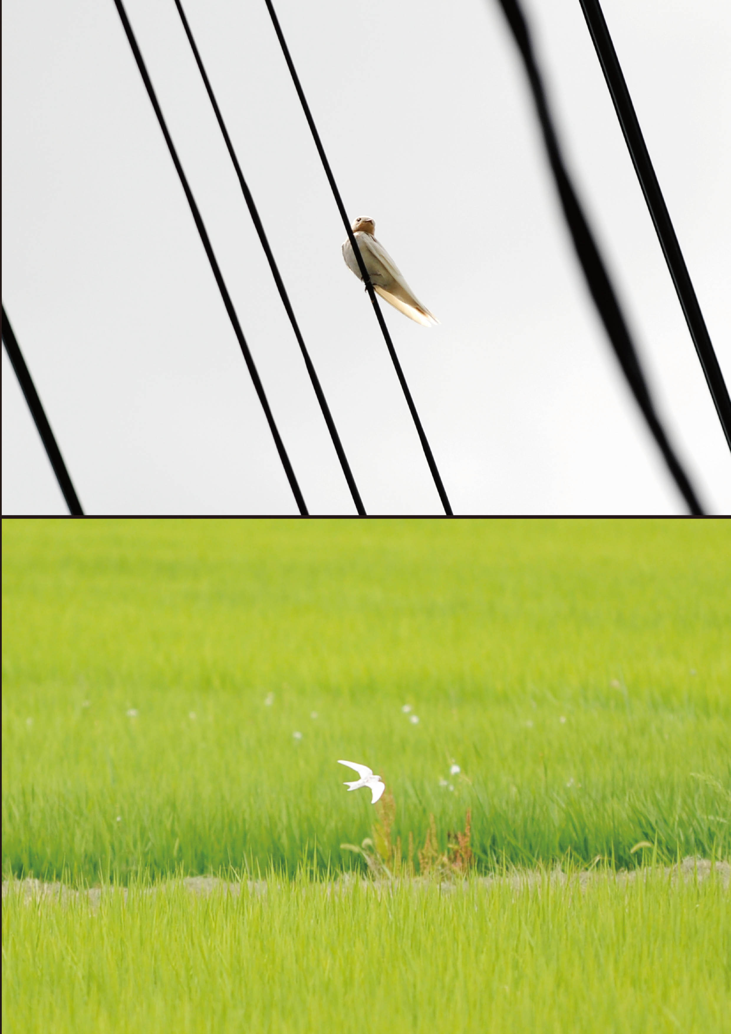 8月8日10時頃、町民の人から白いツバメを見かけたとの情報提供をいただき、早速目撃したという新北町近くの田んぼに行ってみました。 すると間もなく、黒いツバメに交じって1羽の白いツバメが電線に止まっているところ発見しました。その後、猛スピードで田んぼの上空を飛び回っていました。 情報提供ありがとうございました。