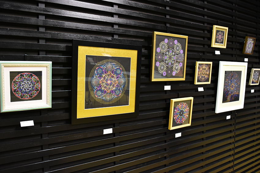 和みいなでは「宙(そら)を奏でる点描曼荼羅画」作品展を6月5日から17日まで開催しています。会場内には、郡山市在住の寺山瑞穂さんと町内在住の小川久美子さんらによる作品45点が展示されています。 6月9日(土)、10日(日)、16日(土)、17日(日)にはミニ点描体験会も開かれます。 カラーペンで描かれた幾何学模様の美しい作品にぜひ触れてみてはいかがでしょうか。