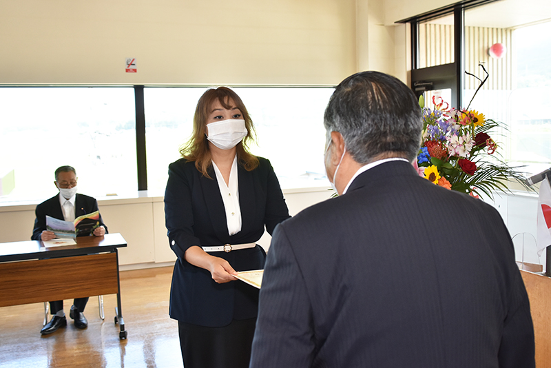 8月4日付けで退任する外国語指導助手のタオ・パさんへの感謝状贈呈式は8月3日、町役場で行われ、前後公町長がタオ・パさんに感謝状と記念品を手渡しました。 タオ・パさんは令和2年1月30日から約1年半にわたって中学校での英語授業の補助などに従事し、生徒との交流を深めました。タオ・パさんは「これからも生徒たちが英語を学び、成長し続けることを願っています」とあいさつを述べました。