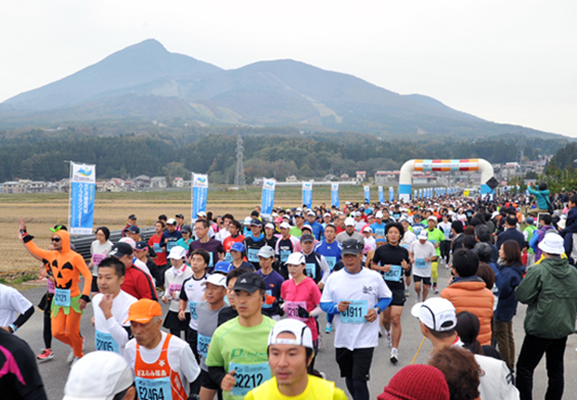 ゼビオ猪苗代湖ハーフマラソン2011は10月30日、秋の深まりを見せる猪苗代湖周辺で開催され、町総合体育館カメリーナをスタート、町サイクルセンターをゴールとするハーフマラソンを中心とした計13部門で、ランナーたちが健脚を競いました。男女ハーフマラソン完走者のうち、30人が東京マラソン2012の出場権を得られるとあって、同クラスには約2400人が出場。完走を目指し、秋の猪苗代路を駆け抜けました。メーン会場となったカメリーナでは、地元産の野菜を使った豚汁や手打ちそばなどが振る舞われ、ランナーや応援の家族などから好評を得ました。