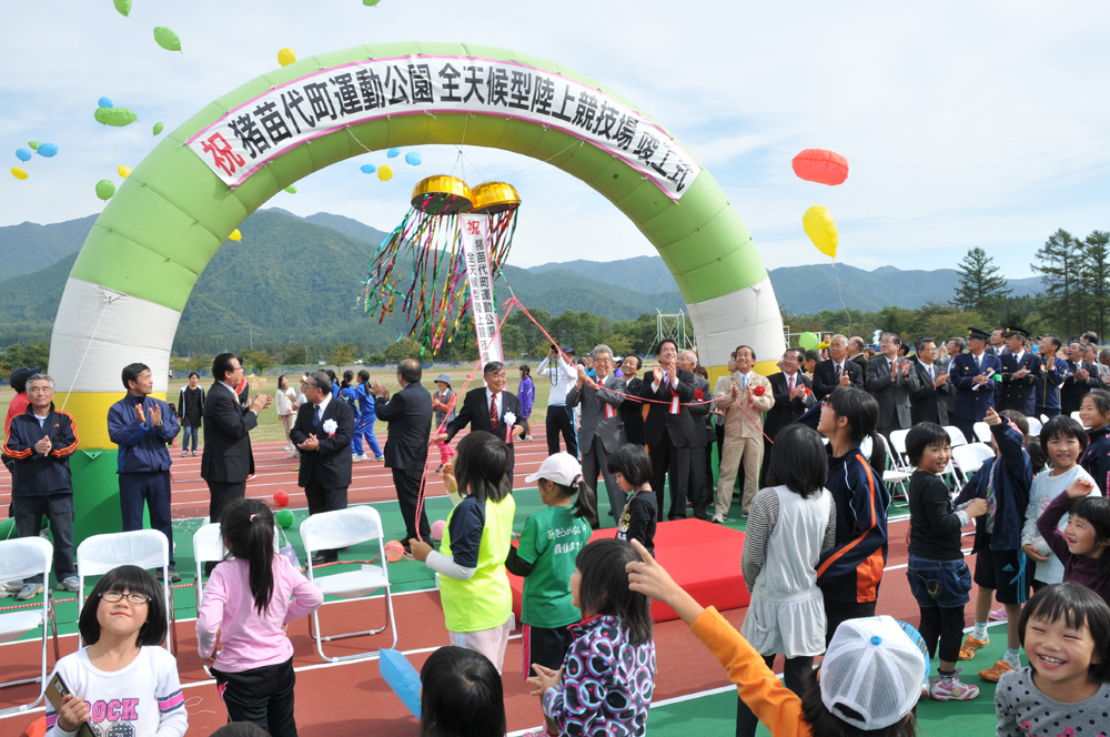 昼休みには全天候型陸上競技場の竣功式が執り行われ、前後公町長の式辞、土屋重憲教育長の事業経過報告の後、鈴木武喜町議会議長、渡部恒三衆議院議員、増子輝彦参議院議員らが祝辞。施工業者には感謝状が贈られました。式典の最後には、関係者らがくす玉を割り、盛大に完成を祝いました。
