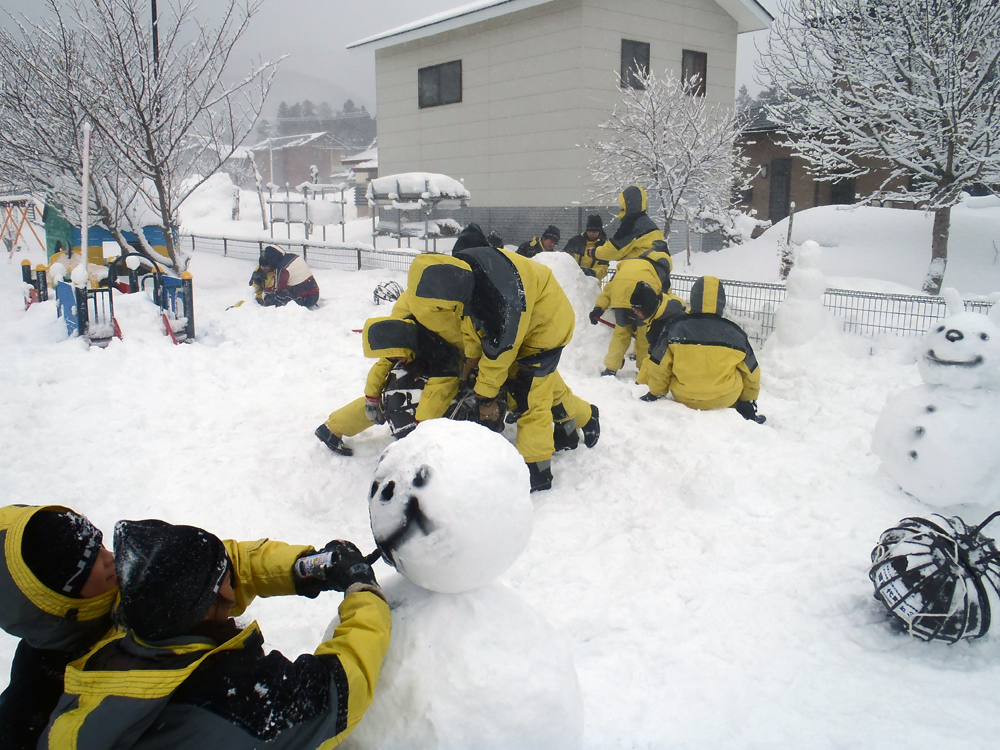 スキー宿泊学習で本町を訪れた茨城県東海村の東海南中1年生は1月25日、さくらこども園で除雪などのボランティアを行いました。1年生66人が訪問し、屋根から落ちた雪を片付けたほか、園児を喜ばせようと、園庭に積もった雪で雪だるまを作りました。作業終了後、土屋重憲教育長が同校に感謝状を贈呈したほか、園児らが手作りのプレゼントを生徒一人一人に手渡しました。記念品として猪苗代観光協会から絵はがきも贈られました。