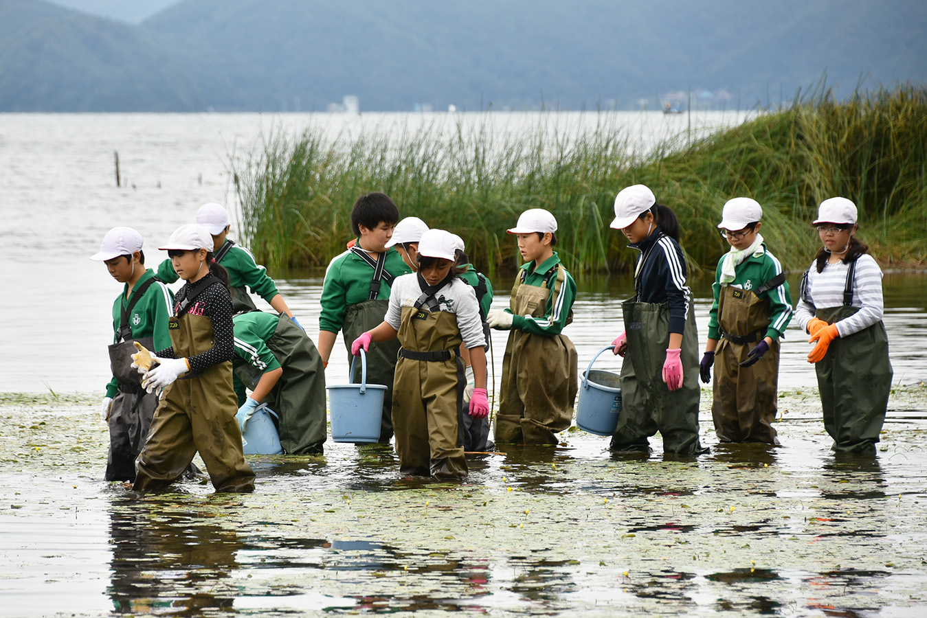 翁島小学校6年生の児童は9月23日、猪苗代湖北岸でアサザの種を採取しました。採取した種は、学校のバケツで栽培し、来年夏ごろ、次の6年生が猪苗代湖に移植します。