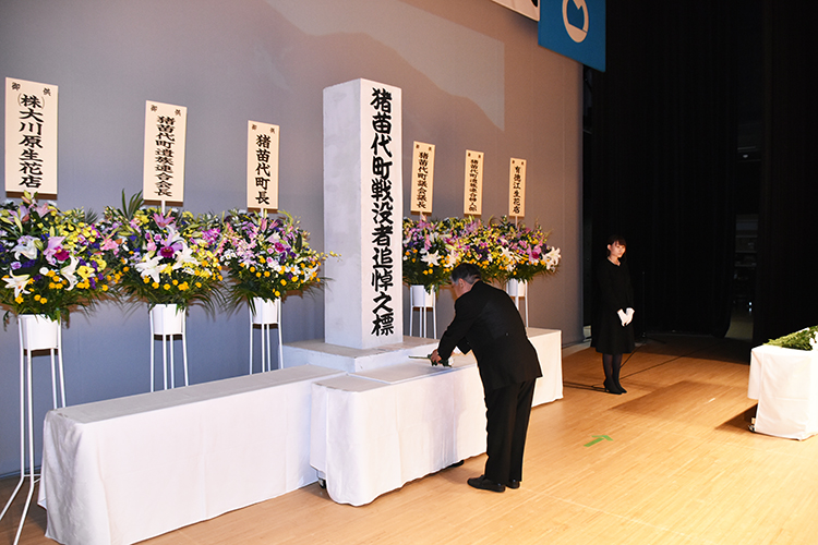 町戦没者追悼式は8月8日、学びいなで行われ、第二次世界大戦で犠牲になった戦没者800余柱の冥福を祈りました。