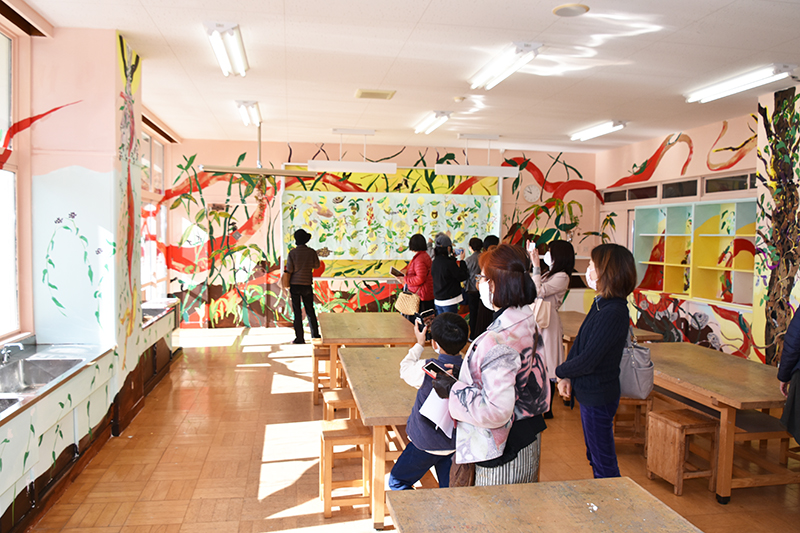 町内の学校の壁を芸術作品で彩る「ウォールアートフェスティバル」は11月6、7の両日、吾妻小学校や吾妻中学校などを舞台に繰り広げられました。 写真は、吾妻小学校図工室に描かれた画家の浅野友里子さんの作品です。