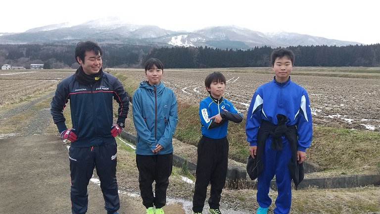 朝練の生徒とクロカン部で3㎞ランニングをしました。この時期に雪がなく走ることができるのは珍しいです。写真の右から2人目の男子生徒が着用しているのは吾妻中学校伝統クロカン部のユニフォームです。腕にある「猪苗代吾妻中学校」を力強く指さして写真撮影をしました。