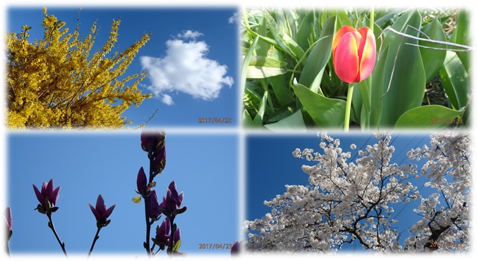 4月23日(日)晴れ。午後4時の気温は13度。やはり、太陽が顔を出すと暖かく感じます。今日は、気持ちの良い1日でした。猪苗代町の桜をはじめとする花々は、これからですが、一足早く春の花々を掲載します。青空をバックに、花々がとてもきれいでした。